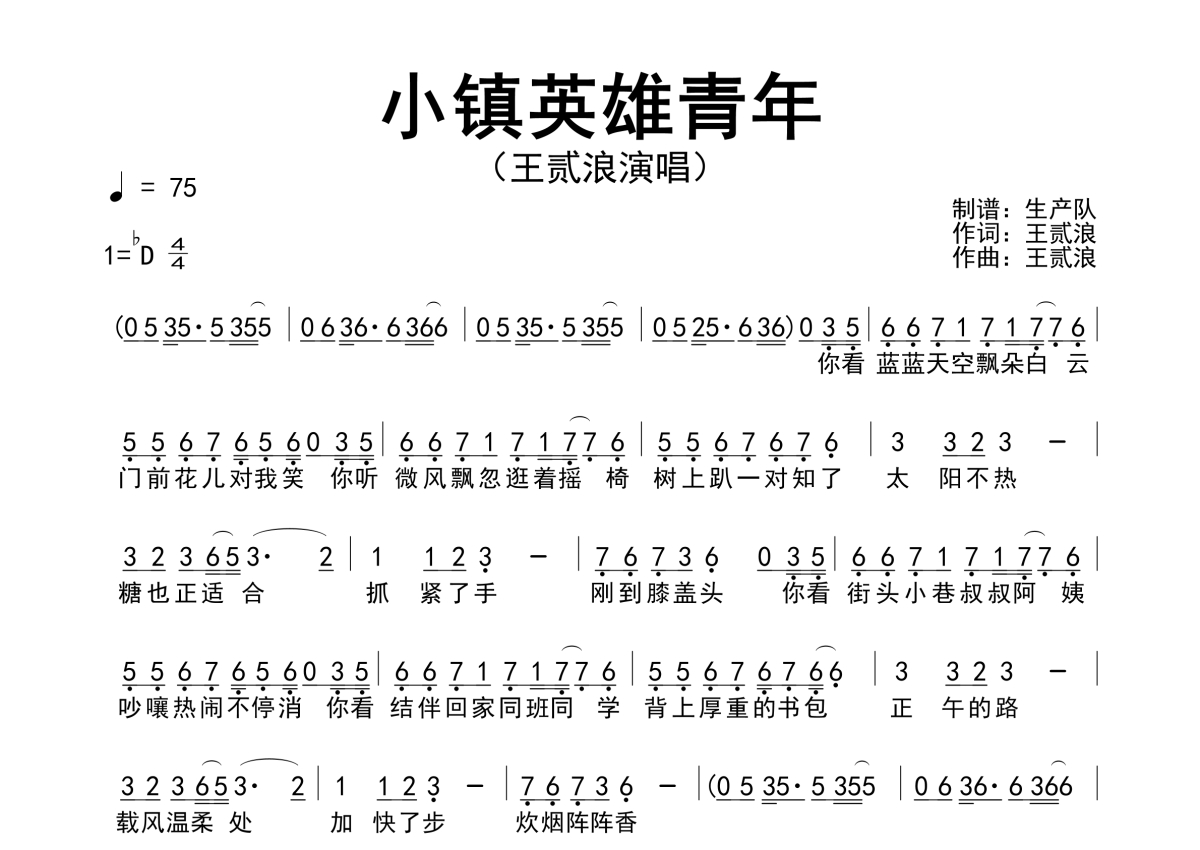 《小镇英雄青年》是王贰浪演唱的一首歌曲,简谱,拍号为4/4拍,歌曲速度为每分钟75拍,这份简谱共有一张高清图谱,图谱由 @生产队 编配上传王贰浪演唱的歌曲《小镇英雄青年》简谱。