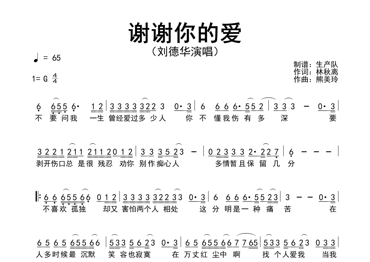 《谢谢你的爱》是刘德华演唱的一首歌曲,简谱,拍号为4/4拍,歌曲速度为每分钟65拍,这份简谱共有一张高清图谱,图谱由 @生产队 编配上传刘德华演唱的歌曲《谢谢你的爱》简谱。