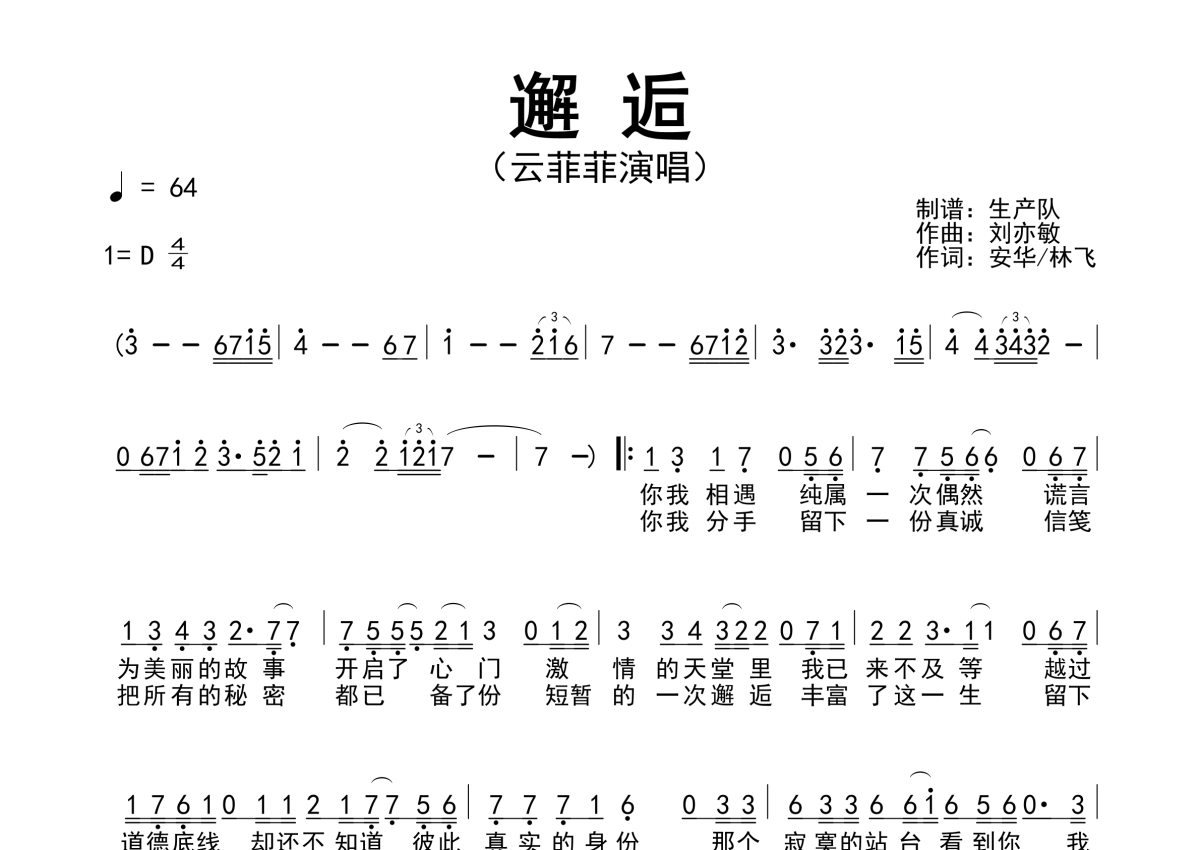 《邂逅》是云菲菲演唱的一首歌曲,简谱,拍号为4/4拍,歌曲速度为每分钟64拍,这份简谱共有一张高清图谱,图谱由 @生产队 编配上传云菲菲演唱的歌曲《邂逅》简谱。