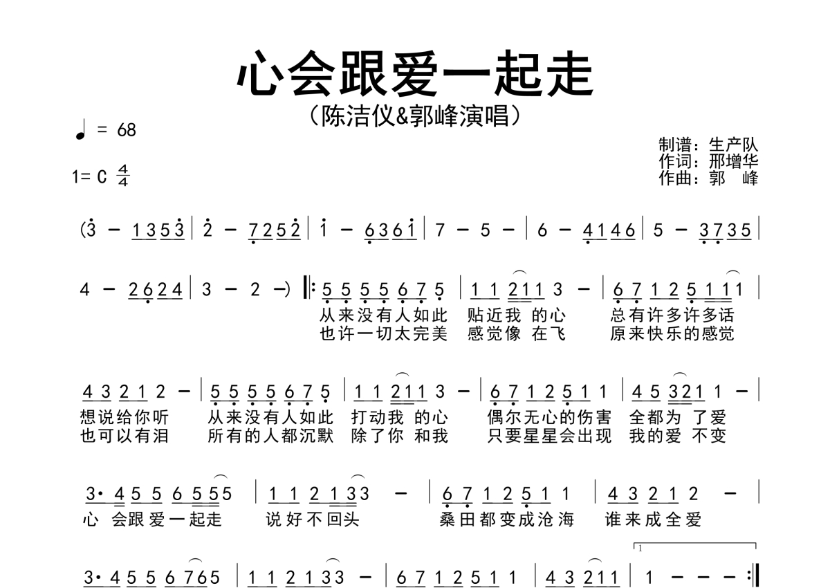 《心会跟爱一起走》是陈洁仪/郭峰演唱的一首歌曲,简谱,拍号为4/4拍,歌曲速度为每分钟68拍,这份简谱共有一张高清图谱,图谱由 @生产队 编配上传郭峰/陈洁仪演唱的歌曲《心会跟爱一起走》简谱。