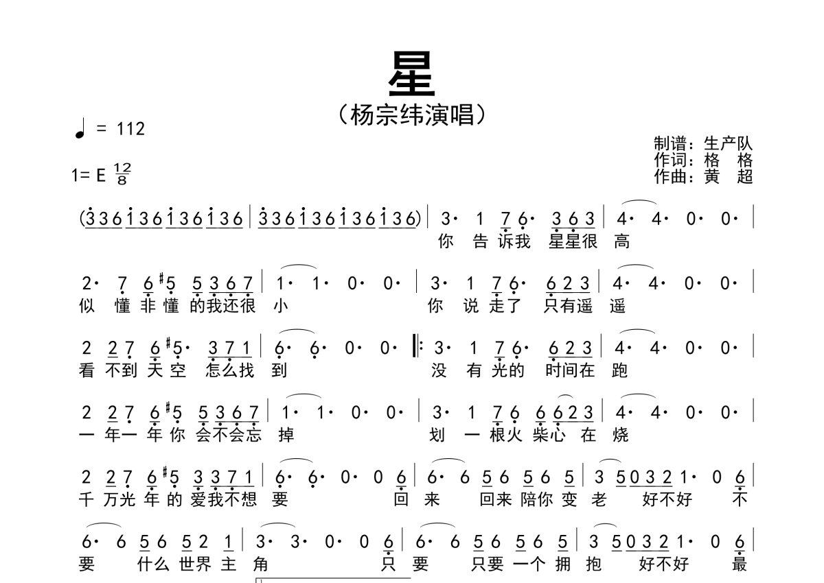 《星》是杨宗纬演唱的一首歌曲,简谱,拍号为6/8拍,歌曲速度为每分钟112拍,这份简谱共有一张高清图谱,图谱由 @生产队 编配上传杨宗纬演唱的歌曲《星》简谱。