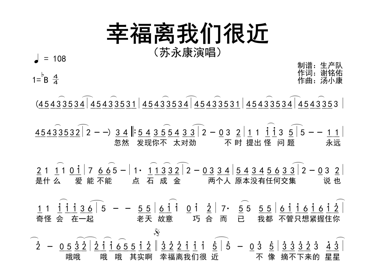 《幸福离我们很近》是苏永康演唱的一首歌曲,简谱,拍号为4/4拍,歌曲速度为每分钟107拍,这份简谱共有一张高清图谱,图谱由 @生产队 编配上传苏永康演唱的歌曲《幸福离我们很近》简谱。