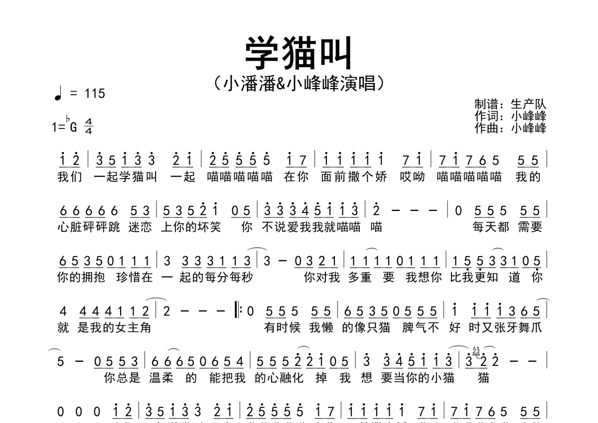 《学猫叫》是小潘潘/小峰峰演唱的一首歌曲,简谱,拍号为4/4拍,歌曲速度为每分钟115拍,这份简谱共有一张高清图谱,图谱由 @生产队 编配上传小峰峰/小潘潘演唱的歌曲《学猫叫》简谱。