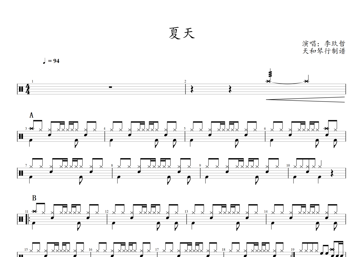 《夏天》是李玖哲演唱的一首歌曲,拍号为4/4拍,这份架子鼓谱共有两张高清图谱,图谱由 @音符喷血者 编配上传,图谱使用五线谱编配,使用这份夏天架子鼓谱,你将能够轻松地敲打出这首李玖哲的夏天,快来尝试吧。