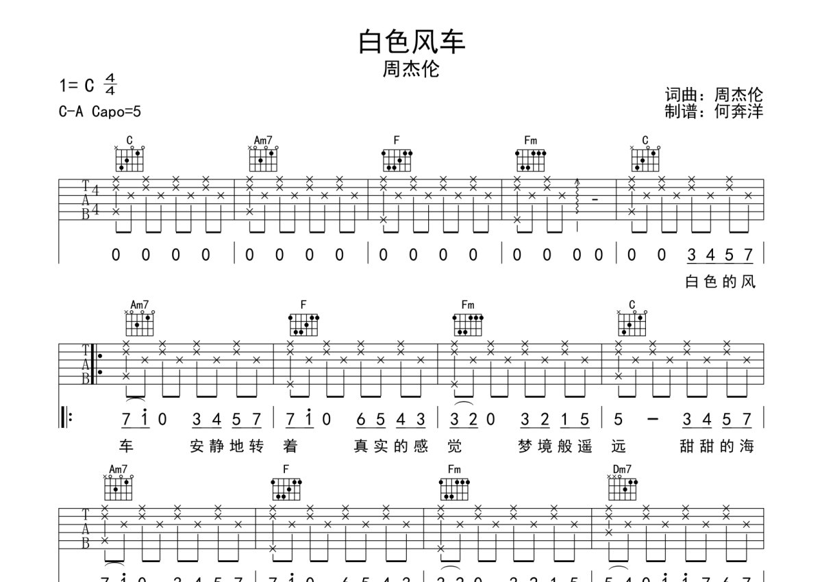 周杰伦《白色风车》吉他谱 - C调弹唱六线谱