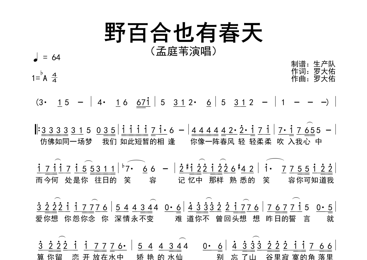 《野百合也有春天》是孟庭苇演唱的一首歌曲,简谱,拍号为4/4拍,歌曲速度为每分钟64拍,这份简谱共有一张高清图谱,图谱由 @生产队 编配上传孟庭苇演唱的歌曲《野百合也有春天》简谱。