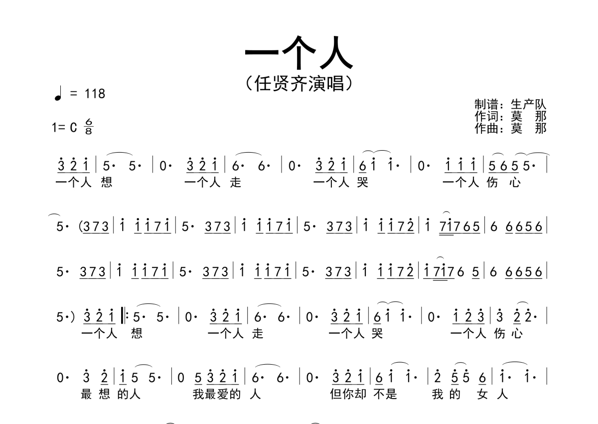 《一个人》是任贤齐演唱的一首歌曲,简谱,拍号为6/8拍,歌曲速度为每分钟118拍,这份简谱共有一张高清图谱,图谱由 @生产队 编配上传任贤齐演唱的歌曲《一个人》简谱。