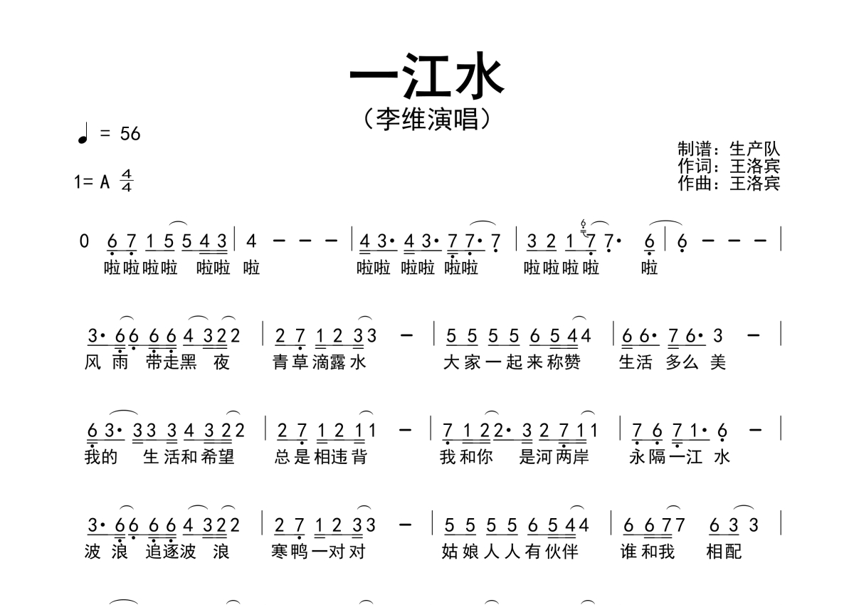 《一江水》是李维演唱的一首歌曲,简谱,拍号为4/4拍,歌曲速度为每分钟56拍,这份简谱共有一张高清图谱,图谱由 @生产队 编配上传李维演唱的歌曲《一江水》简谱。