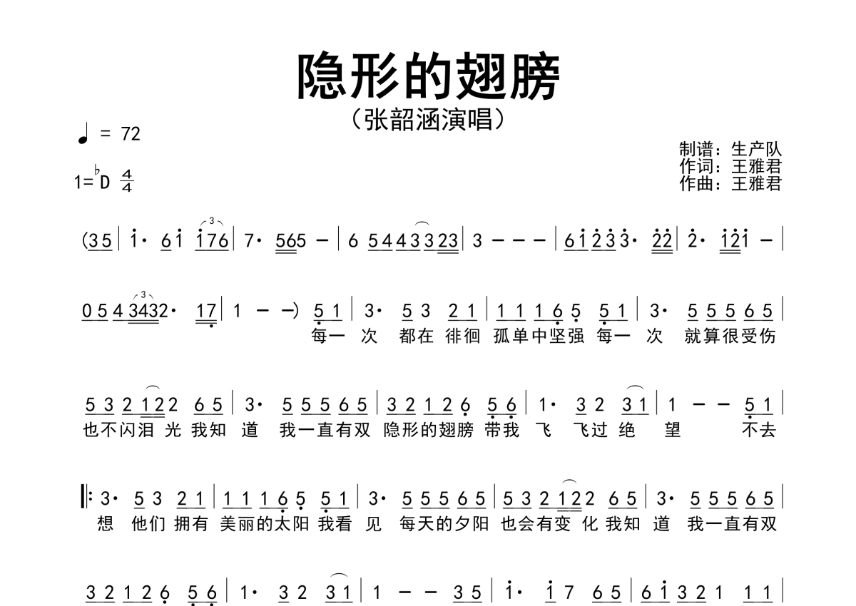 《隐形的翅膀》是张韶涵演唱的一首歌曲,简谱,拍号为4/4拍,歌曲速度为每分钟72拍,这份简谱共有一张高清图谱,图谱由 @生产队 编配上传张韶涵演唱的歌曲《隐形的翅膀》简谱。