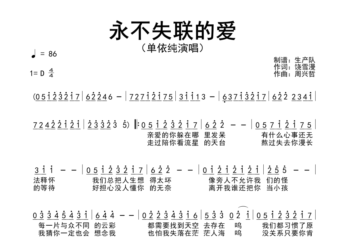 《永不失联的爱》是单依纯演唱的一首歌曲,简谱,拍号为4/4拍,歌曲速度为每分钟86拍,这份简谱共有一张高清图谱,图谱由 @生产队 编配上传单依纯演唱的歌曲《永不失联的爱》简谱。