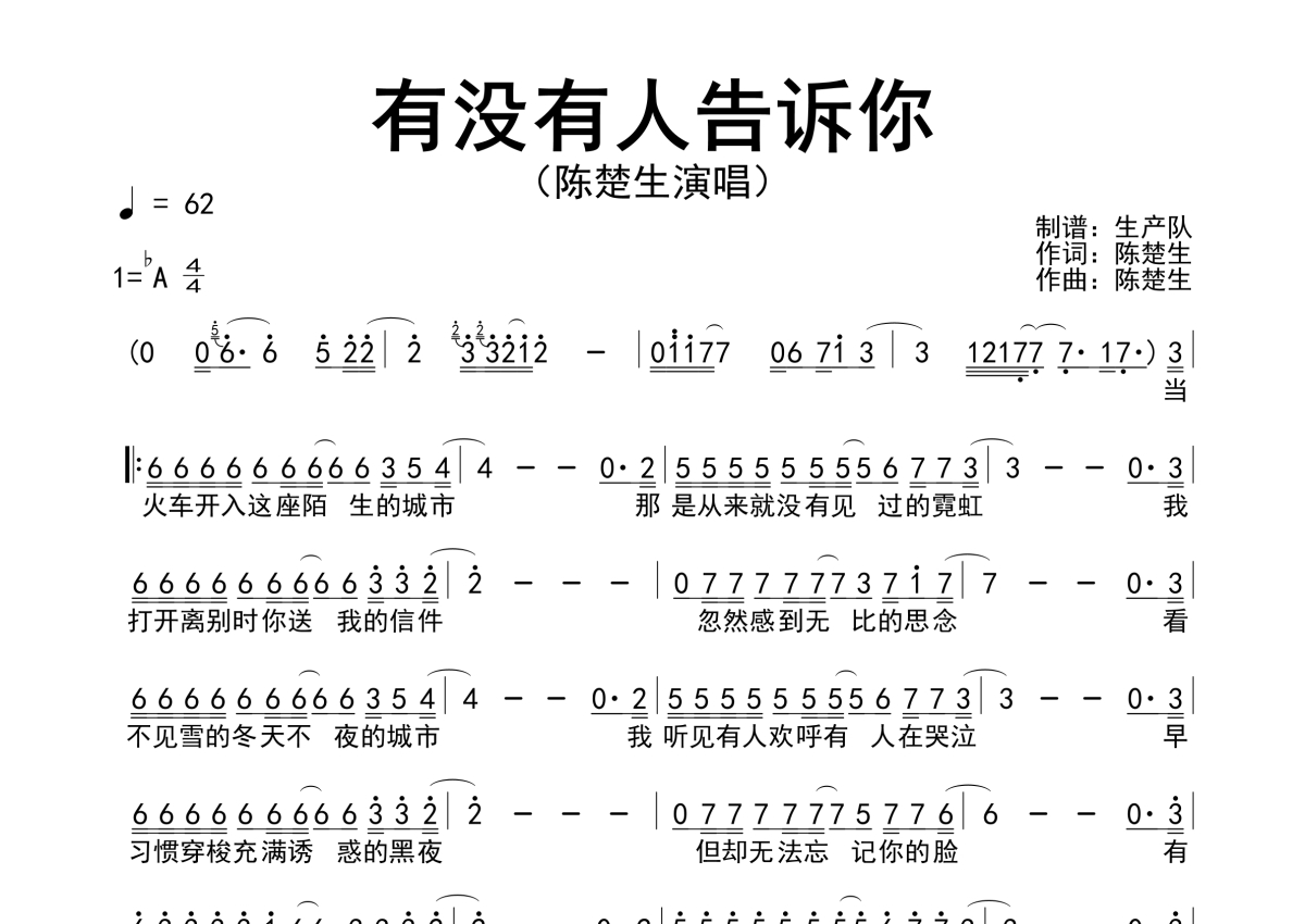 《有没有人告诉你》是陈楚生演唱的一首歌曲,简谱,拍号为4/4拍,歌曲速度为每分钟62拍,这份简谱共有一张高清图谱,图谱由 @生产队 编配上传陈楚生演唱的歌曲《有没有人告诉你》简谱。