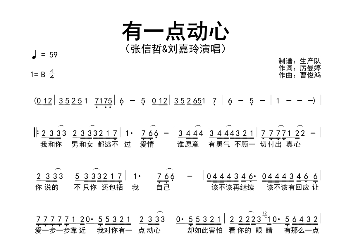 《有一点动心》是刘嘉玲/张信哲演唱的一首歌曲,简谱,拍号为4/4拍,歌曲速度为每分钟59拍,这份简谱共有一张高清图谱,图谱由 @生产队 编配上传张信哲/刘嘉玲演唱的歌曲《有一点动心》简谱。