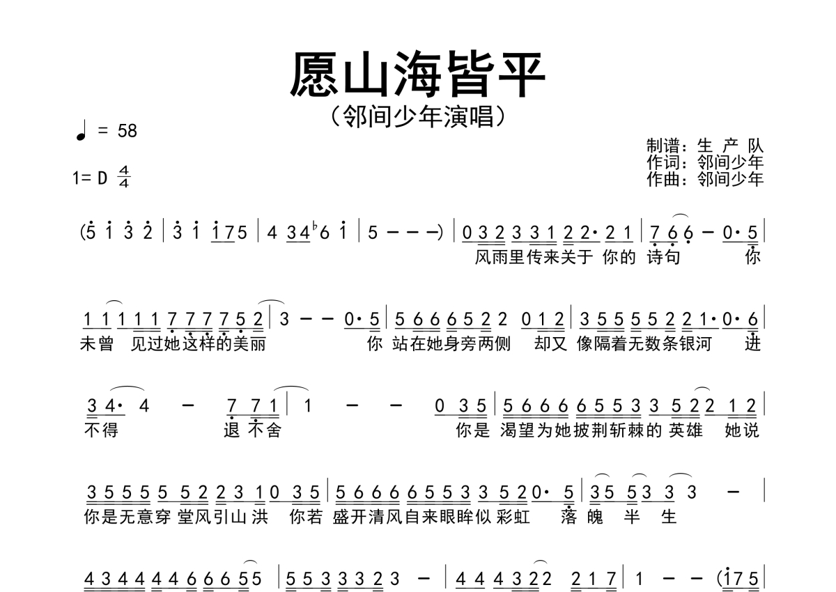 《愿山海皆平》是邻间少年演唱的一首歌曲,简谱,拍号为4/4拍,歌曲速度为每分钟58拍,这份简谱共有一张高清图谱,图谱由 @生产队 编配上传邻间少年演唱的歌曲《愿山海皆平》简谱。
