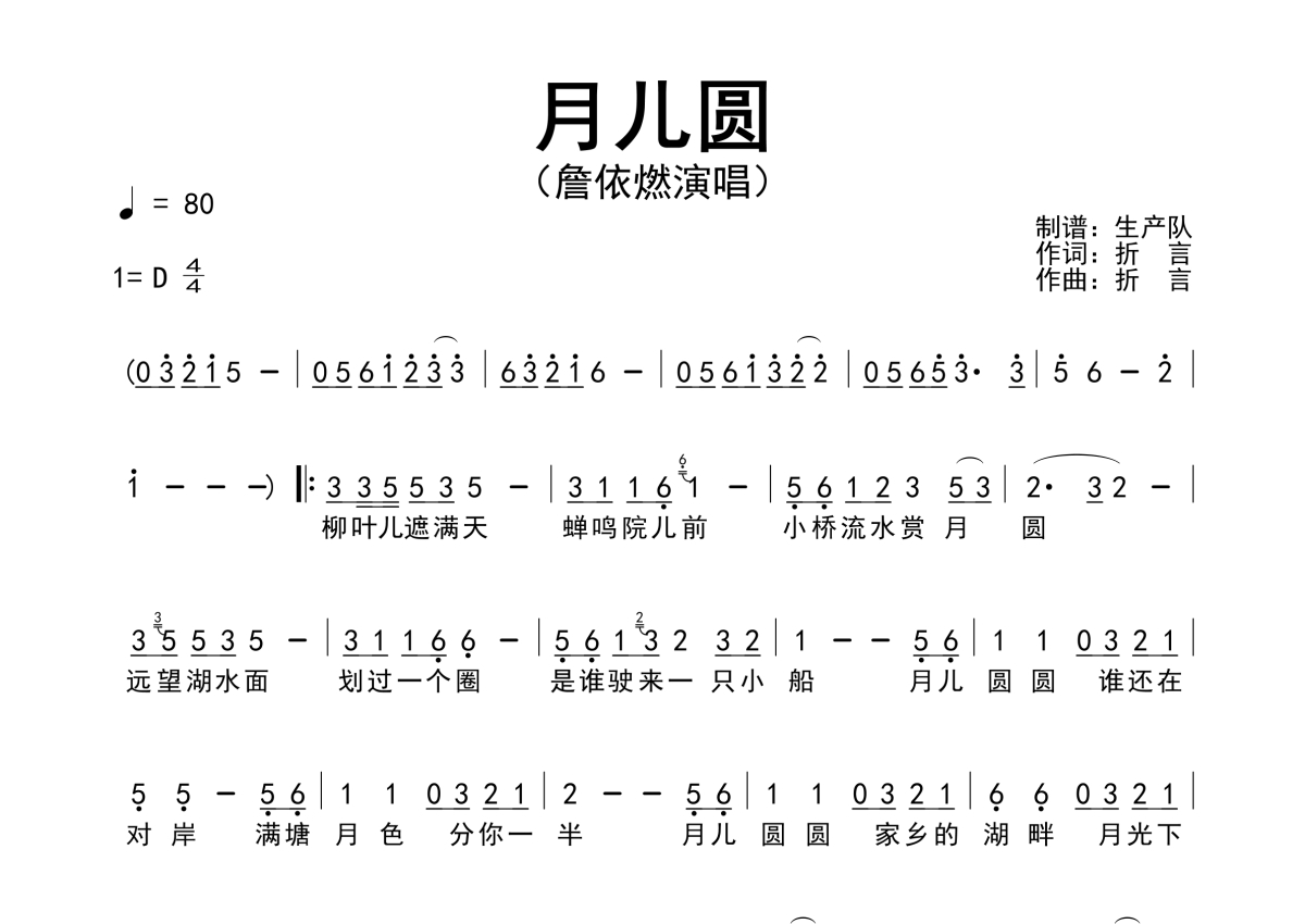 《月儿圆》是詹依燃演唱的一首歌曲,简谱,拍号为4/4拍,歌曲速度为每分钟80拍,这份简谱共有一张高清图谱,图谱由 @生产队 编配上传詹依燃演唱的歌曲《月儿圆》简谱。