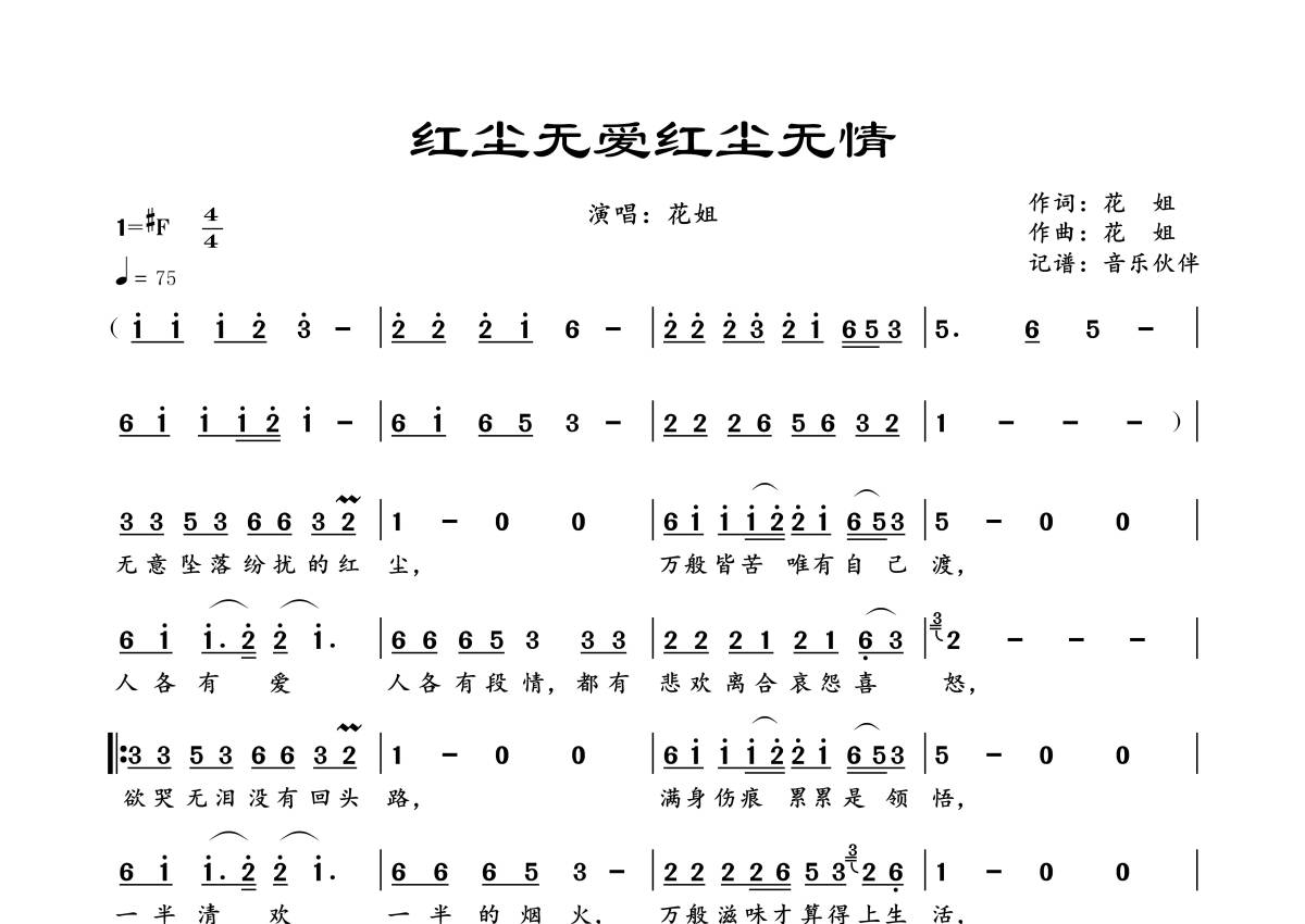 《红尘无爱红尘无情》是花姐演唱的一首歌曲,拍号为4/4拍,歌曲速度为每分钟75拍,这份简谱共有一张高清图谱,图谱由 @音乐伙伴 编配上传。