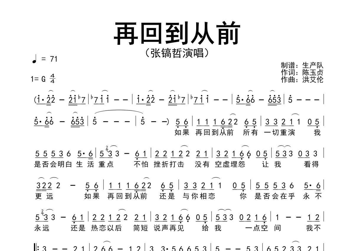 《再回到从前》是张镐哲演唱的一首歌曲,简谱,拍号为4/4拍,歌曲速度为每分钟71拍,这份简谱共有一张高清图谱,图谱由 @生产队 编配上传张镐哲演唱的歌曲《再回到从前》简谱。