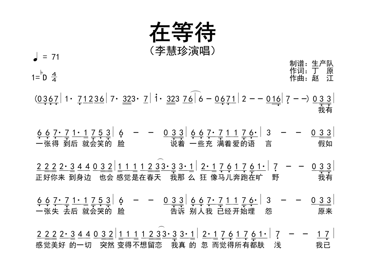 《在等待》是李慧珍演唱的一首歌曲,简谱,拍号为4/4拍,歌曲速度为每分钟71拍,这份简谱共有一张高清图谱,图谱由 @生产队 编配上传李慧珍演唱的歌曲《在等待》简谱。