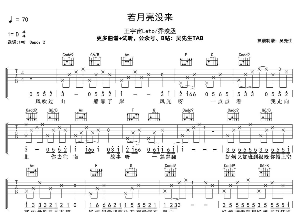 《若月亮没来》是王宇宙Leto /乔浚丞演唱的一首歌曲,拍号为4/4拍,歌曲速度为每分钟70拍,歌曲原调为D调,但由于原调指法比较难,为了方便弹奏,本吉他谱采用的是C调指法编配,变调夹2品弹奏即为原调,当然也可以根据自己的音域改变变调夹位置,或者通过改变和弦调性,以方便自己弹奏,这份吉他谱共有两张高清图谱,图谱由 @吴先生TAB 编配上传,图谱使用六线谱编配,包含吉他和弦指法、简谱以及歌词部分,曲谱配备了相关的音频提供试听,使用这份若月亮没来吉他谱,可以让你更加方便地掌握这首歌曲的弹唱技巧,快来尝试吧。