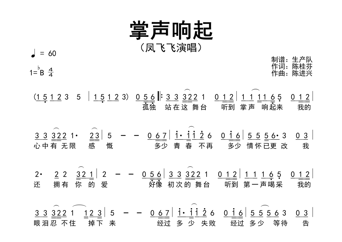 《掌声响起》是凤飞飞演唱的一首歌曲,简谱,拍号为4/4拍,歌曲速度为每分钟60拍,这份简谱共有一张高清图谱,图谱由 @生产队 编配上传凤飞飞演唱的歌曲《掌声响起》简谱。