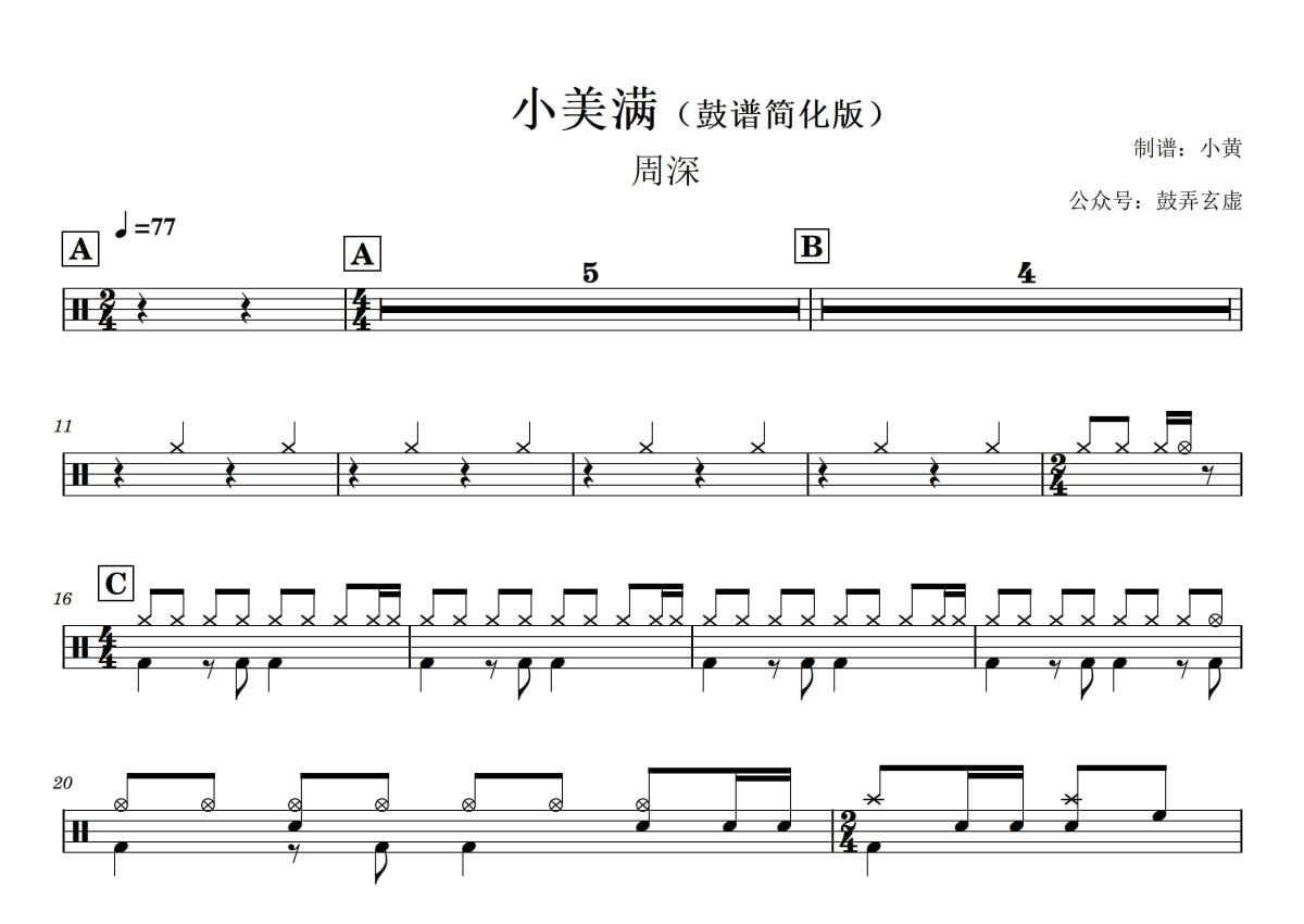《小美满》是简化版演唱的一首歌曲,简化版,拍号为2/4拍,歌曲速度为每分钟77拍,这份架子鼓谱共有两张高清图谱,图谱由 @小黄 编配上传,图谱使用五线谱编配,使用这份小美满架子鼓谱,你将能够轻松地敲打出这首简化版的小美满,快来尝试吧。