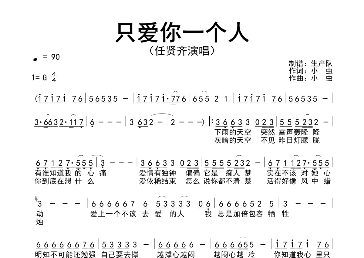《只爱你一个人》是任贤齐演唱的一首歌曲,简谱,这份简谱共有一张高清图谱,图谱由 @生产队 编配上传任贤齐演唱的歌曲《只爱你一个人》简谱。