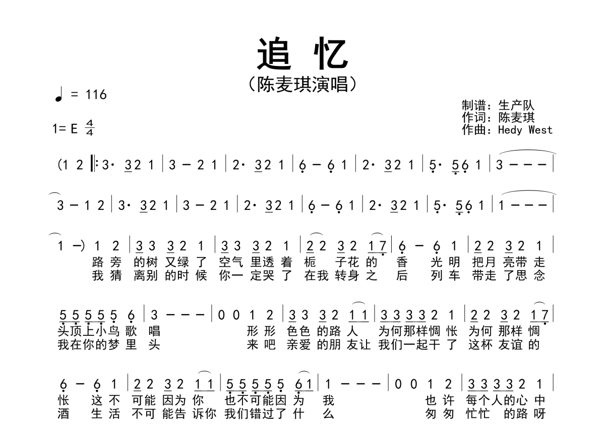 《追忆》是陈麦琪演唱的一首歌曲,简谱,拍号为4/4拍,歌曲速度为每分钟116拍,这份简谱共有一张高清图谱,图谱由 @生产队 编配上传陈麦琪演唱的歌曲《追忆》简谱。