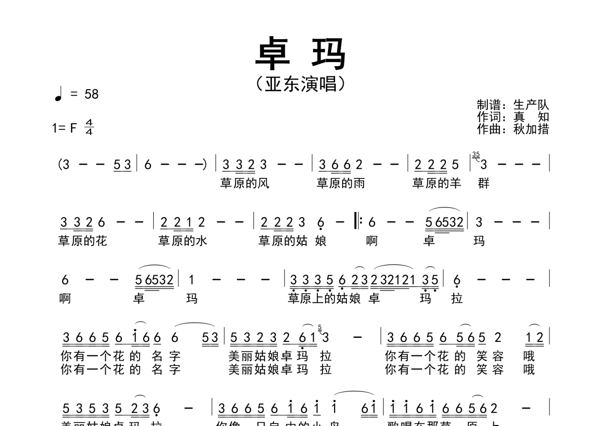 《卓玛》是亚东演唱的一首歌曲,简谱,拍号为4/4拍,歌曲速度为每分钟58拍,这份简谱共有一张高清图谱,图谱由 @生产队 编配上传亚东演唱的歌曲《卓玛》简谱。
