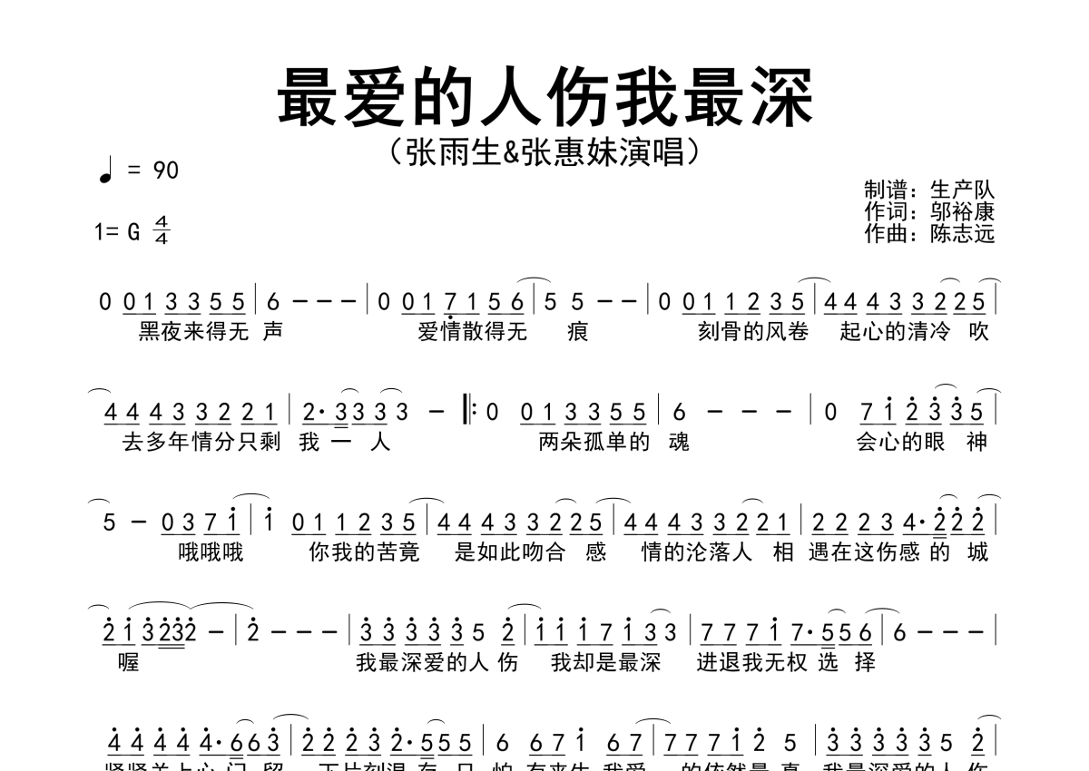 《最爱的人伤我最深》是张雨生/张惠妹演唱的一首歌曲,简谱,拍号为4/4拍,歌曲速度为每分钟90拍,这份简谱共有一张高清图谱,图谱由 @生产队 编配上传张惠妹/张雨生演唱的歌曲《最爱的人伤我最深》简谱。