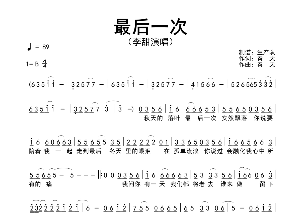 《最后一次》是李甜演唱的一首歌曲,简谱,拍号为4/4拍,歌曲速度为每分钟89拍,这份简谱共有一张高清图谱,图谱由 @生产队 编配上传李甜演唱的歌曲《最后一次》简谱。