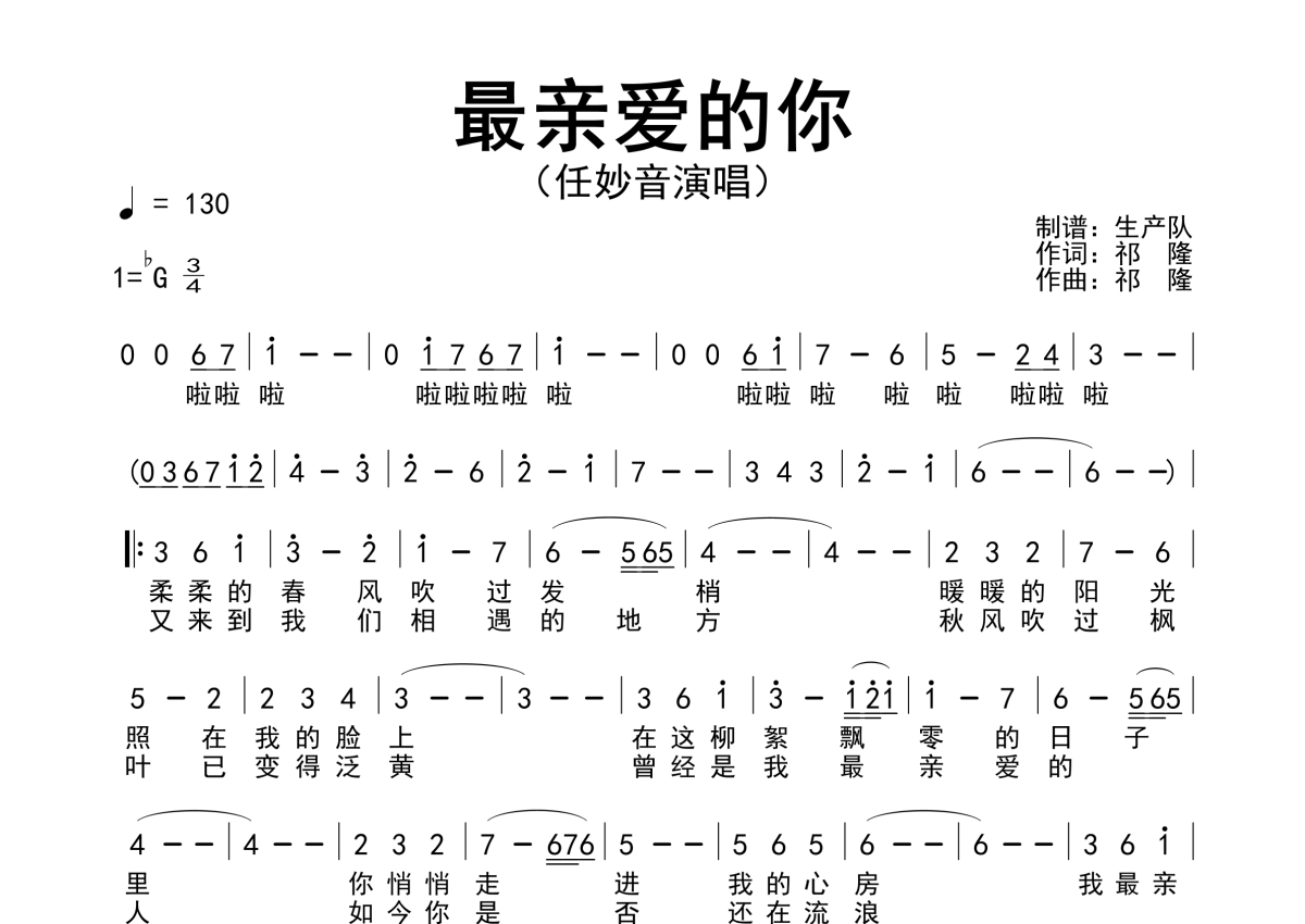 《最亲爱的你》是任妙音演唱的一首歌曲,拍号为3/4拍,歌曲速度为每分钟130拍,这份简谱共有一张高清图谱,图谱由 @生产队 编配上传任妙音演唱的歌曲《最亲爱的你》简谱。