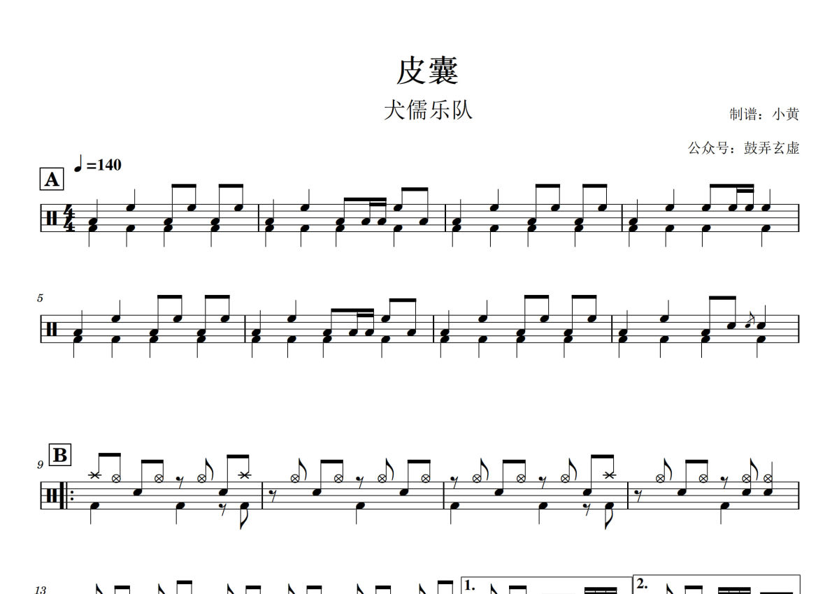 《皮囊》是犬儒乐队演唱的一首歌曲,拍号为4/4拍,歌曲速度为每分钟140拍,这份架子鼓谱共有三张高清图谱,图谱由 @小黄 编配上传,图谱使用五线谱编配,使用这份皮囊架子鼓谱,你将能够轻松地敲打出这首犬儒乐队的皮囊,快来尝试吧。