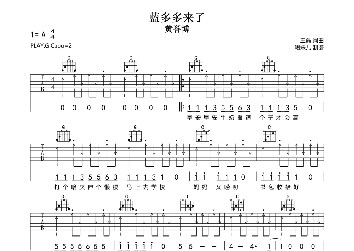 《蓝多多来了》是黄誉博演唱的一首歌曲,拍号为4/4拍,歌曲速度为每分钟85拍,歌曲原调为G调,本吉他谱采用的是G调指法编配,变调夹2品弹奏即为原调,当然也可以根据自己的音域改变变调夹位置,或者通过改变和弦调性,以方便自己弹奏,这份吉他谱共有两张高清图谱,图谱由 @珺妹儿 编配上传,图谱使用六线谱编配,包含吉他和弦指法、简谱以及歌词部分,使用这份蓝多多来了吉他谱,可以让你更加方便地掌握这首歌曲的弹唱技巧,快来尝试吧。