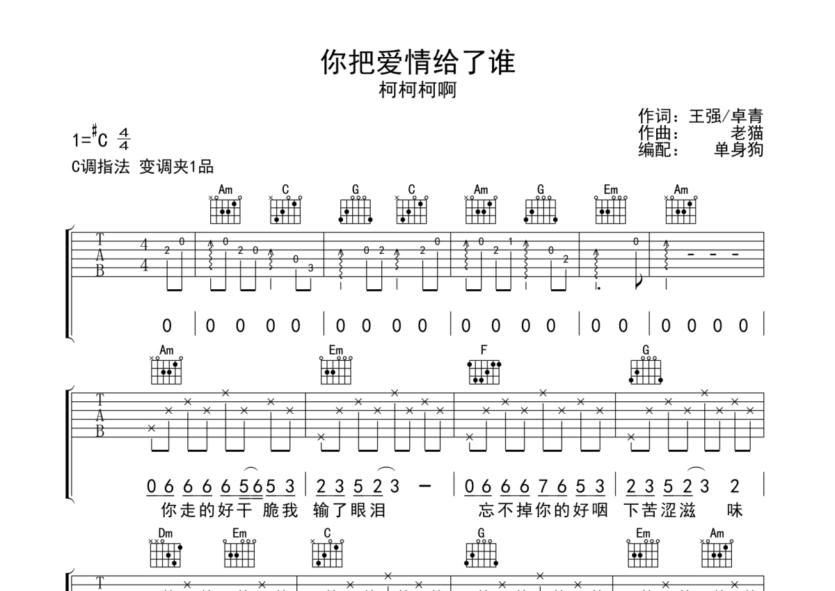 柯柯柯啊《你把爱情给了谁》吉他谱 - C调弹唱六线谱
