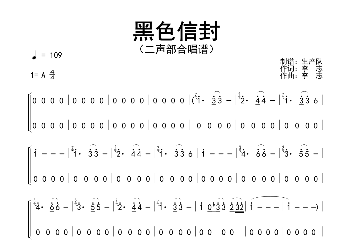 《黑色信封》是合唱谱演唱的一首歌曲,二声部合唱谱,拍号为4/4拍,歌曲速度为每分钟109拍,这份简谱共有三张高清图谱,图谱由 @生产队 编配上传李志演唱的歌曲《黑色信封》(二声部合唱谱)。