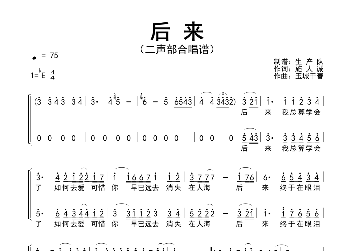 合唱谱《后来》简谱 - 二声部合唱谱
