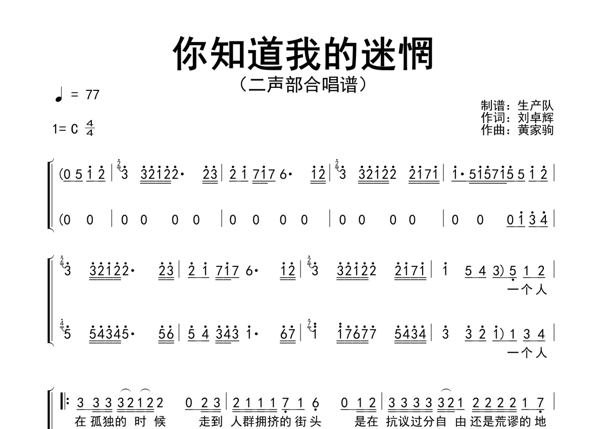 合唱谱《你知道我的迷惘》简谱 - 二声部合唱谱