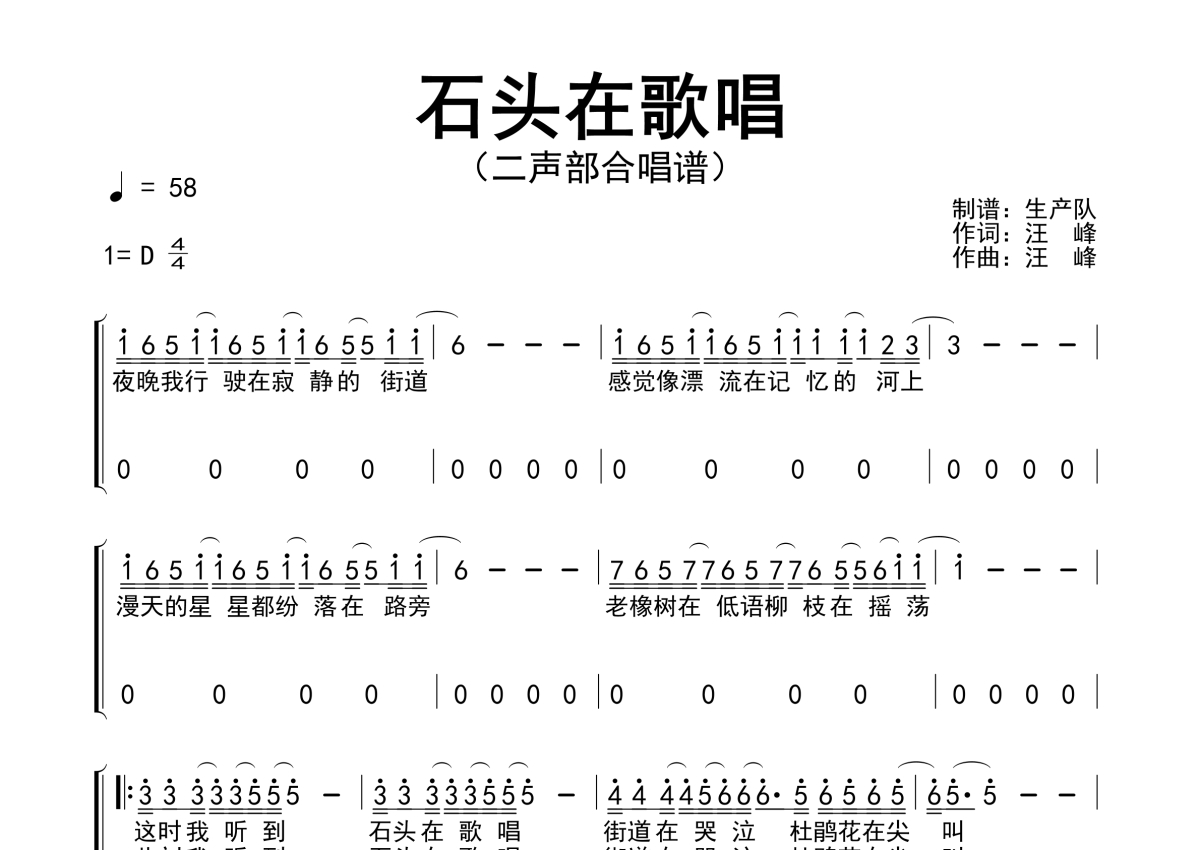 《石头在歌唱》是合唱谱演唱的一首歌曲,二声部合唱谱,拍号为4/4拍,歌曲速度为每分钟58拍,这份简谱共有三张高清图谱,图谱由 @生产队 编配上传谭维维/汪峰演唱的歌曲《石头在歌唱》(二声部合唱谱)。