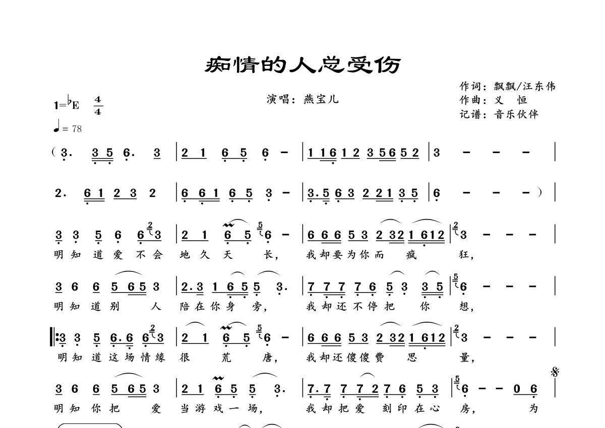 《痴情的人总受伤》是燕宝儿演唱的一首歌曲,拍号为4/4拍,歌曲速度为每分钟78拍,这份简谱共有一张高清图谱,图谱由 @音乐伙伴 编配上传。