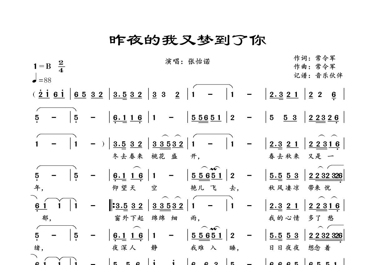 《昨夜的我又梦到了你》是张怡诺演唱的一首歌曲,拍号为2/4拍,歌曲速度为每分钟88拍,这份简谱共有一张高清图谱,图谱由 @音乐伙伴 编配上传。