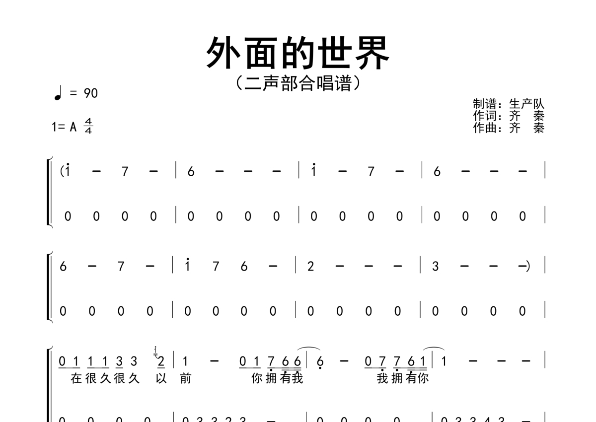 《外面的世界》是齐秦演唱的一首歌曲,二声部合唱谱,拍号为4/4拍,歌曲速度为每分钟90拍,这份简谱共有两张高清图谱,图谱由 @生产队 编配上传齐秦演唱的歌曲《外面的世界》(二声部合唱谱)!。