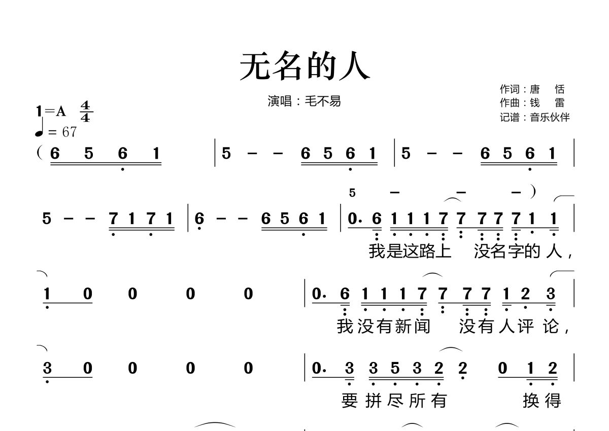 无名的人简谱 - 毛不易演唱