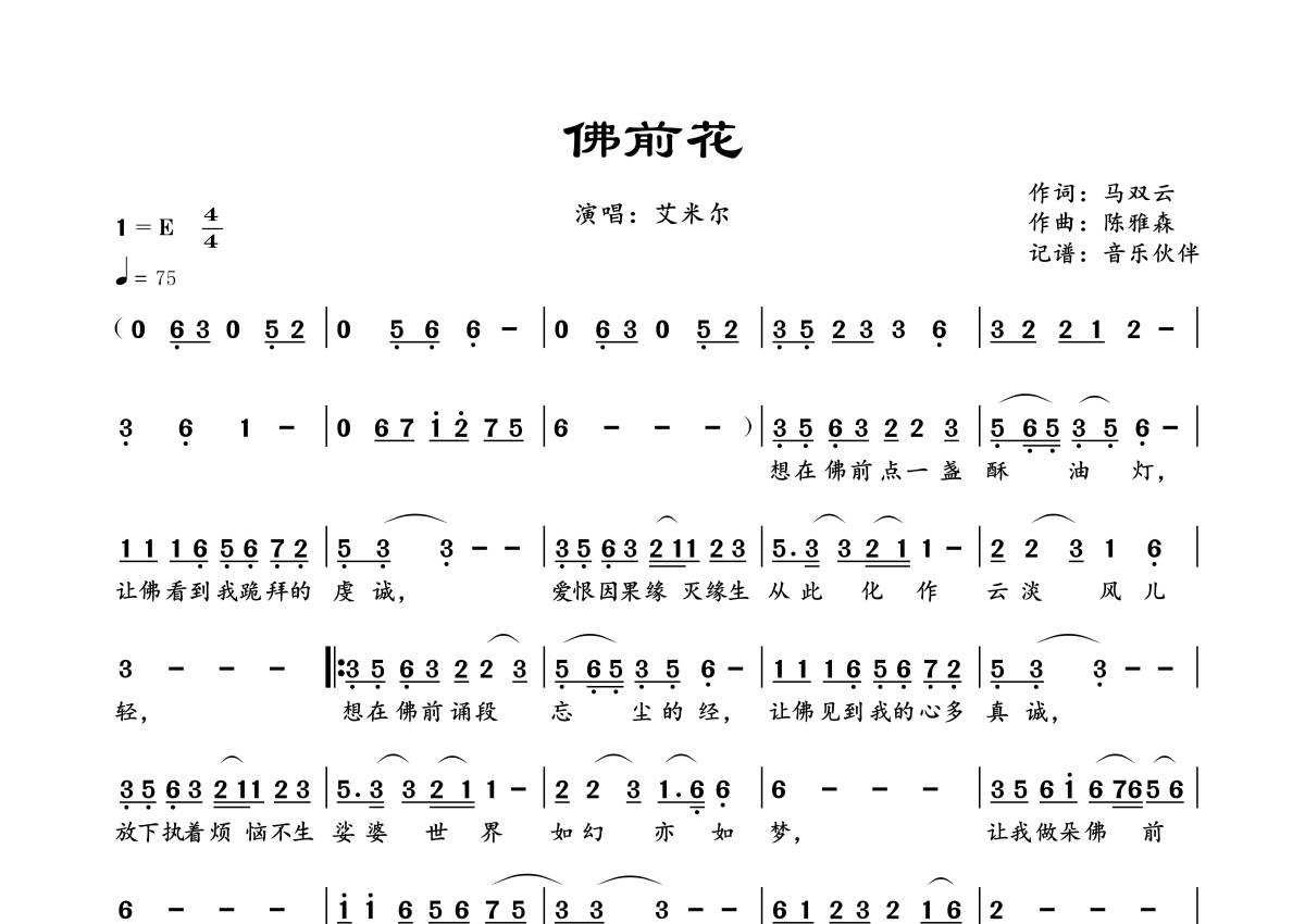 《佛前花》是艾米尔演唱的一首歌曲,拍号为4/4拍,歌曲速度为每分钟75拍,这份简谱共有一张高清图谱,图谱由 @音乐伙伴 编配上传。