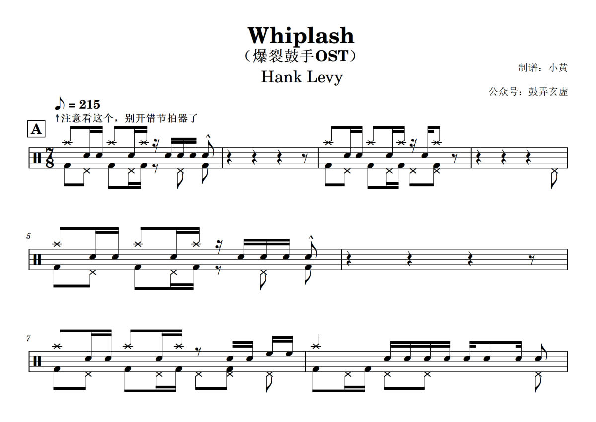 《Whiplash》是Hank Levy演唱的一首歌曲,歌曲速度为每分钟215拍,这份架子鼓谱共有四张高清图谱,图谱由 @小黄 编配上传,图谱使用五线谱编配,使用这份Whiplash架子鼓谱,你将能够轻松地敲打出这首Hank Levy的Whiplash,快来尝试吧。