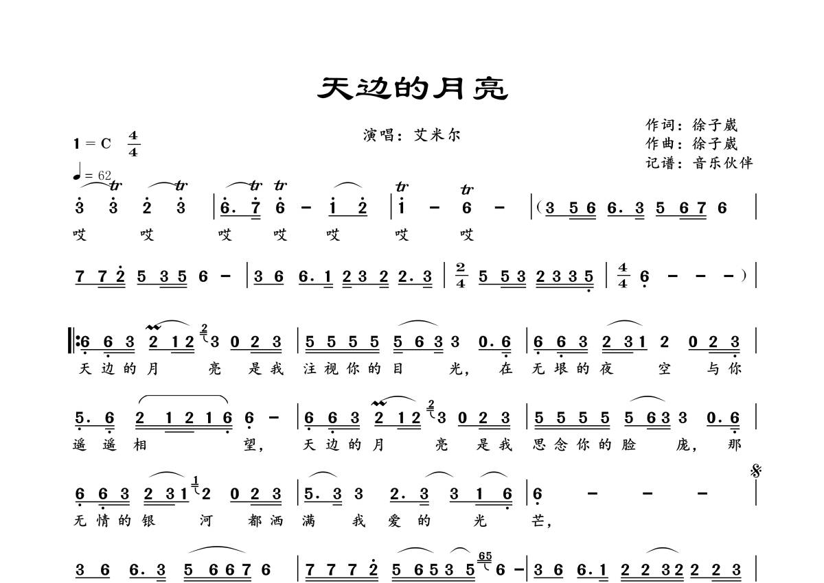 《天边的月亮》是艾米尔演唱的一首歌曲,拍号为4/4拍,歌曲速度为每分钟62拍,这份简谱共有一张高清图谱,图谱由 @音乐伙伴 编配上传。