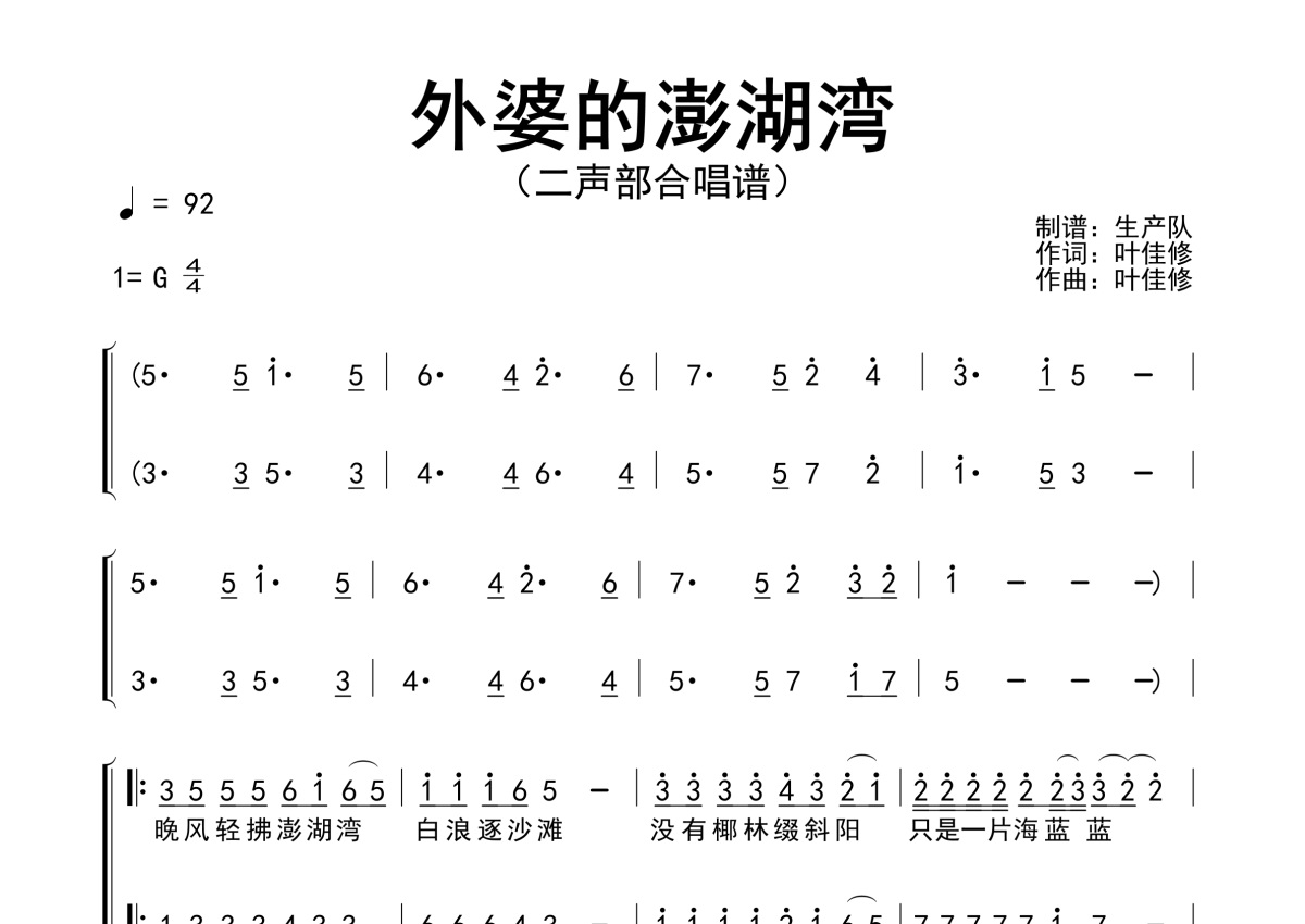 《外婆的澎湖湾》是潘安邦演唱的一首歌曲,二声部合唱谱,拍号为4/4拍,歌曲速度为每分钟92拍,这份简谱共有三张高清图谱,图谱由 @生产队 编配上传潘安邦演唱的歌曲《外婆的澎湖湾》(二声部合唱谱)!。