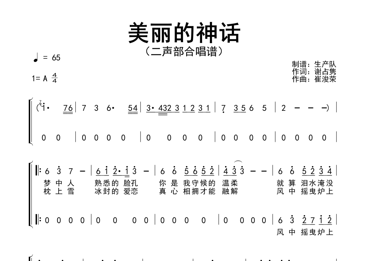 《美丽的神话》是合唱谱演唱的一首歌曲,二声部合唱谱,拍号为4/4拍,歌曲速度为每分钟65拍,这份简谱共有三张高清图谱,图谱由 @生产队 编配上传孙楠/韩红演唱的歌曲《美丽的神话》(二声部合唱谱)!。