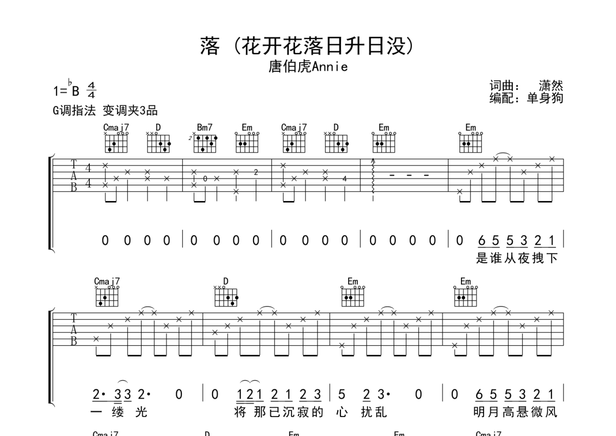 《落》是唐伯虎Annie演唱的一首歌曲,拍号为4/4拍,歌曲原调为Bb调,但由于原调指法比较难,为了方便弹奏,本吉他谱采用的是G调指法编配,变调夹3品弹奏即为原调,当然也可以根据自己的音域改变变调夹位置,或者通过改变和弦调性,以方便自己弹奏,这份吉他谱共有两张高清图谱,图谱由 @单身狗 编配上传,图谱使用六线谱编配,包含吉他和弦指法、简谱以及歌词部分,使用这份落吉他谱,可以让你更加方便地掌握这首歌曲的弹唱技巧,快来尝试吧。