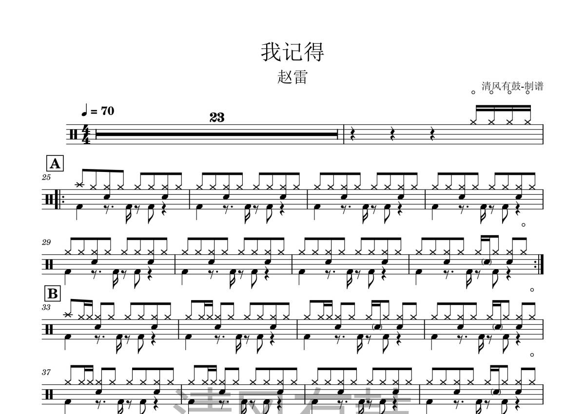《我记得》是赵雷演唱的一首歌曲,拍号为4/4拍,歌曲速度为每分钟70拍,这份架子鼓谱共有两张高清图谱,图谱由 @王远康 编配上传,图谱使用五线谱编配,使用这份我记得架子鼓谱,你将能够轻松地敲打出这首赵雷的我记得,快来尝试吧。
