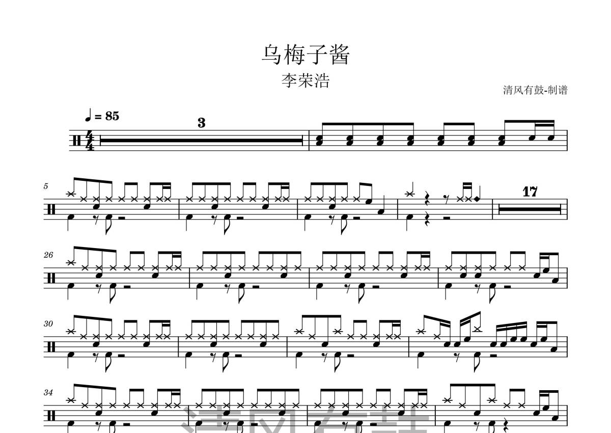 李荣浩《乌梅子酱》架子鼓谱