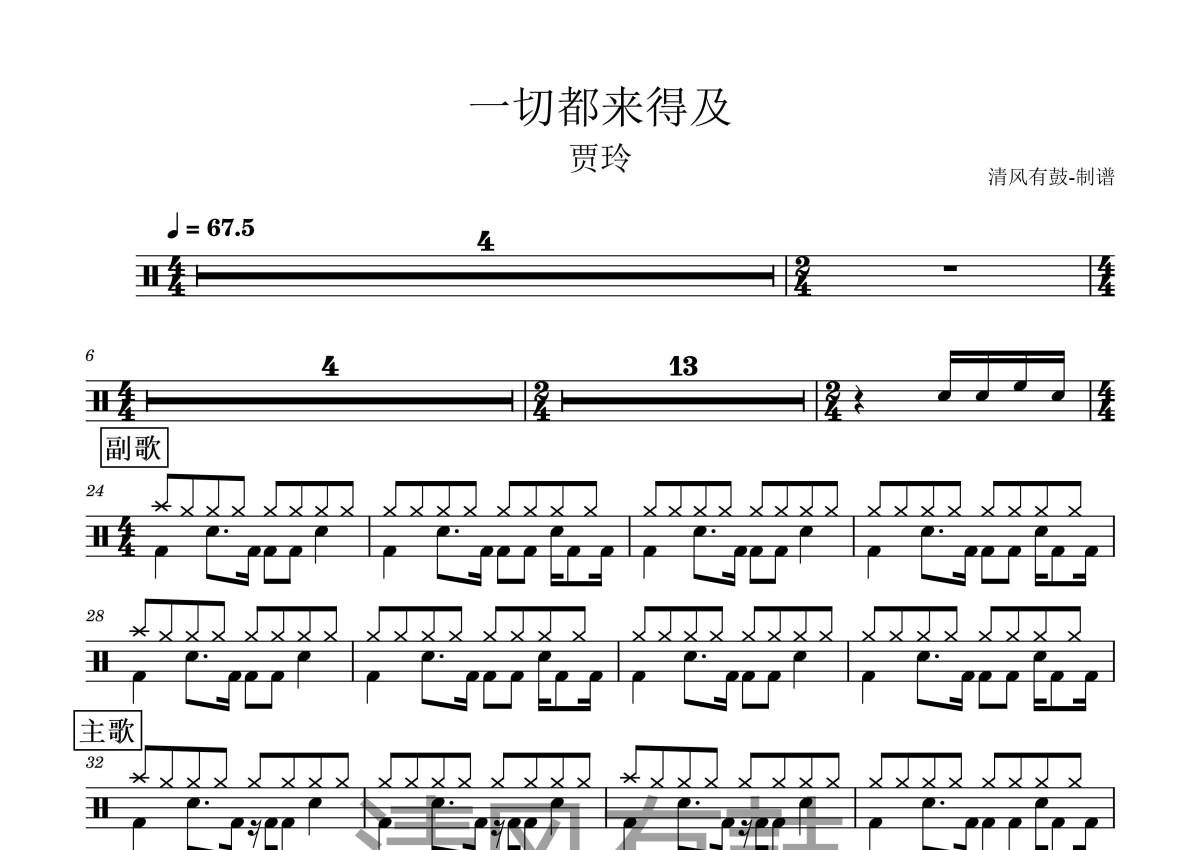 《一切都来得及》是贾玲演唱的一首歌曲,拍号为4/4拍,歌曲速度为每分钟67.5拍,这份架子鼓谱共有两张高清图谱,图谱由 @王远康 编配上传,图谱使用五线谱编配,使用这份一切都来得及架子鼓谱,你将能够轻松地敲打出这首贾玲的一切都来得及,快来尝试吧。